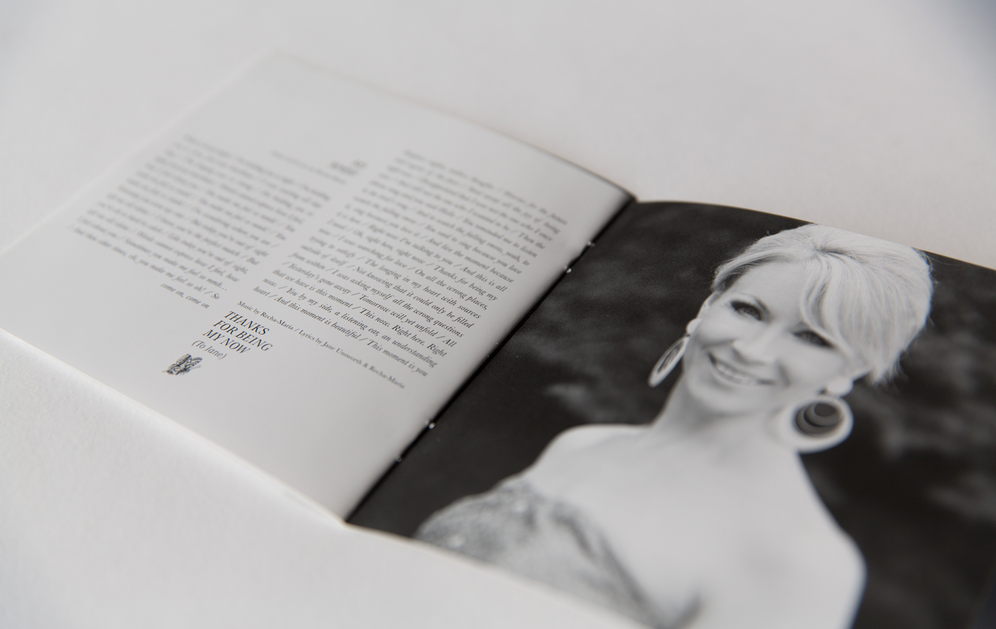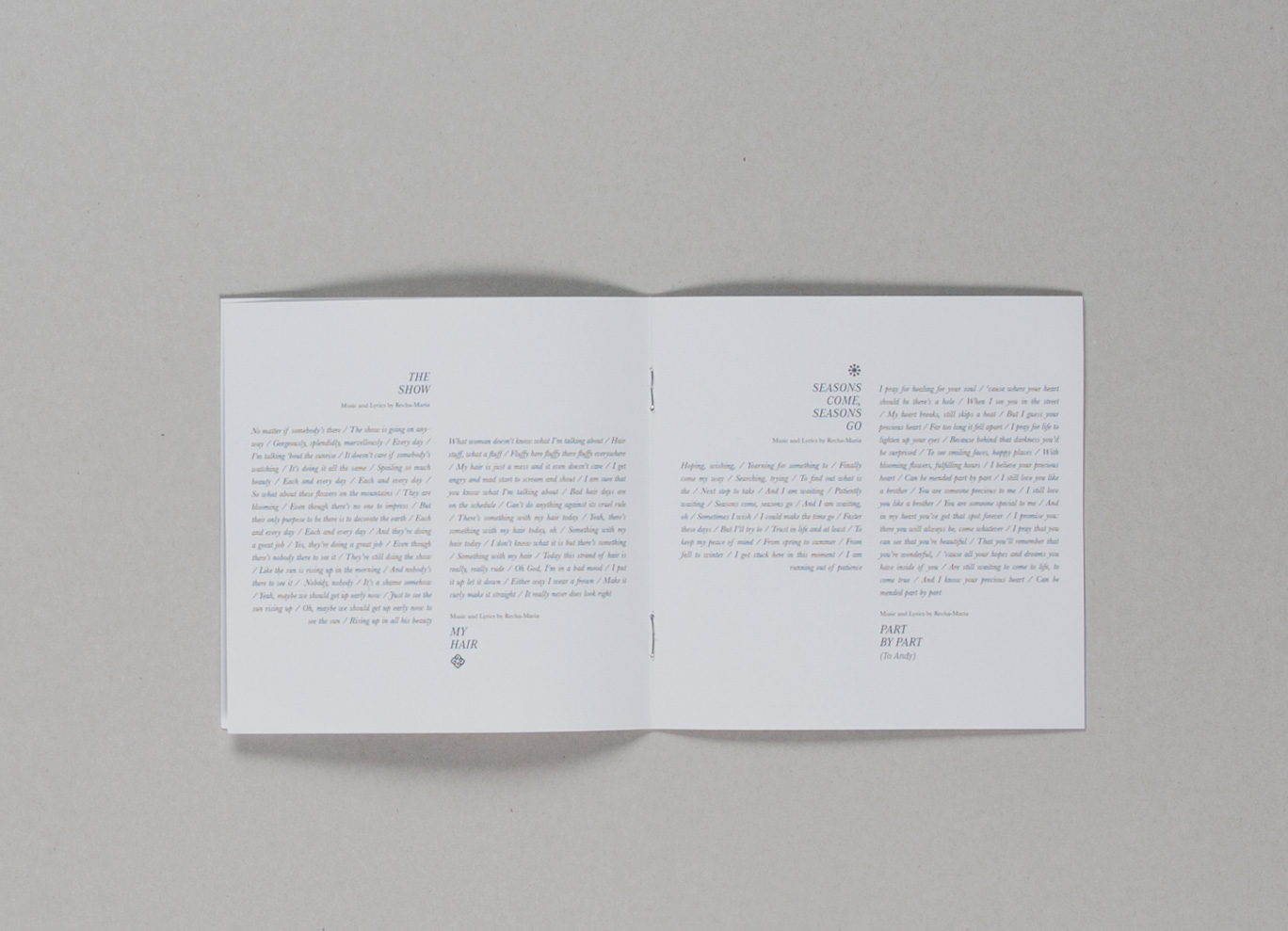 "Die Soul-poppigen Kompositionen strahlen eine wunderbar entspannte Eleganz aus." Verspielte Klänge, eine facettenreiche und ausdrucksstarke Stimme und glasklare Töne bilden die Grundlage für die Gestaltung des Albums "Good to have you back". Feine, dezente und verspielte Text- und Bildelemente kontrastieren mit den direkten, schnörkellosen und klaren Bildsprache der schwarzweiss Fotografien.