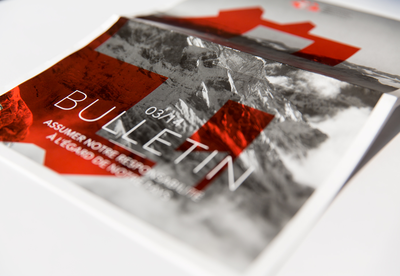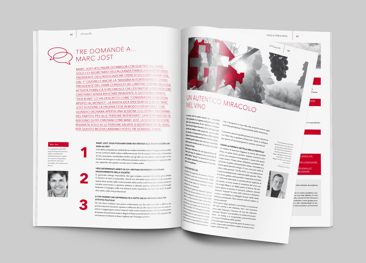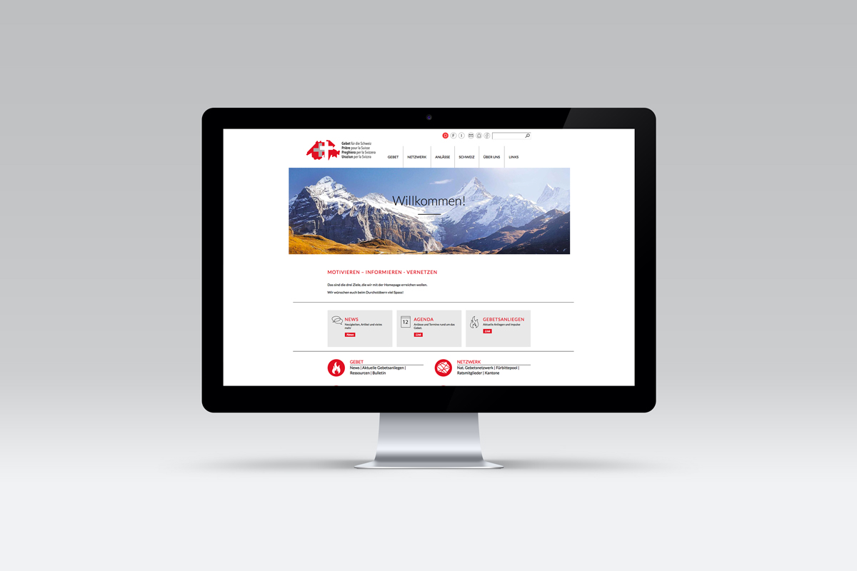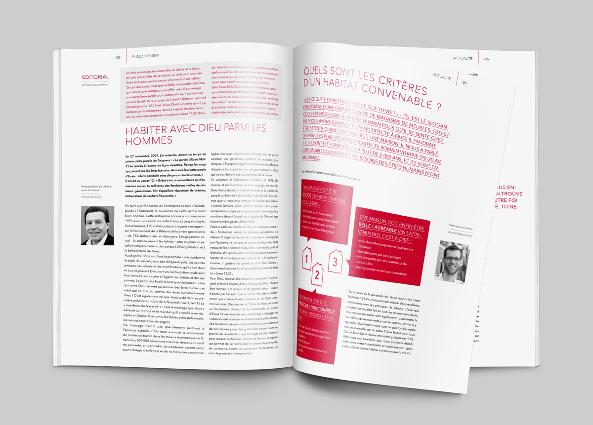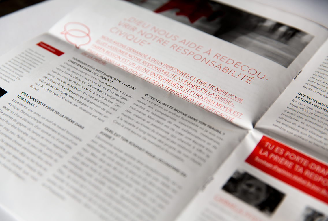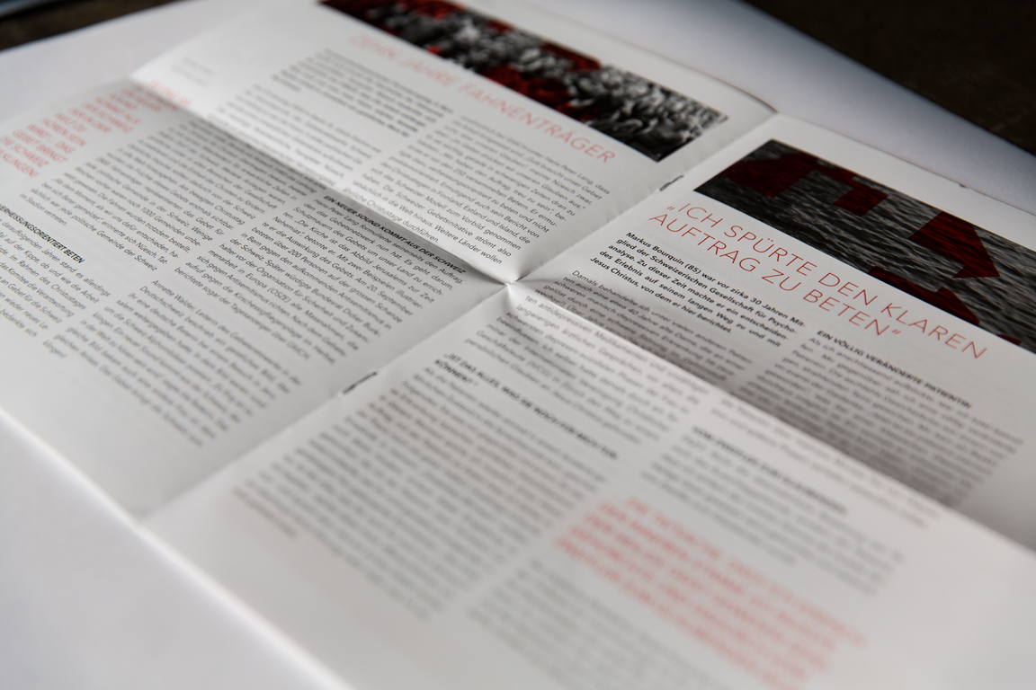 Das vierteljährlich erscheinende Bulletin und die Website von Gebet für die Schweiz wurden gestalterisch aufgefrischt und überarbeitet. Die Bildmarke wird in der Broschüre als wiederkehrendes visuelles Element eingesetzt und dient zusätzlich als farbdefinierende Instanz. Entstanden ist ein schlichtes, übersichtliches und modernes Design.
