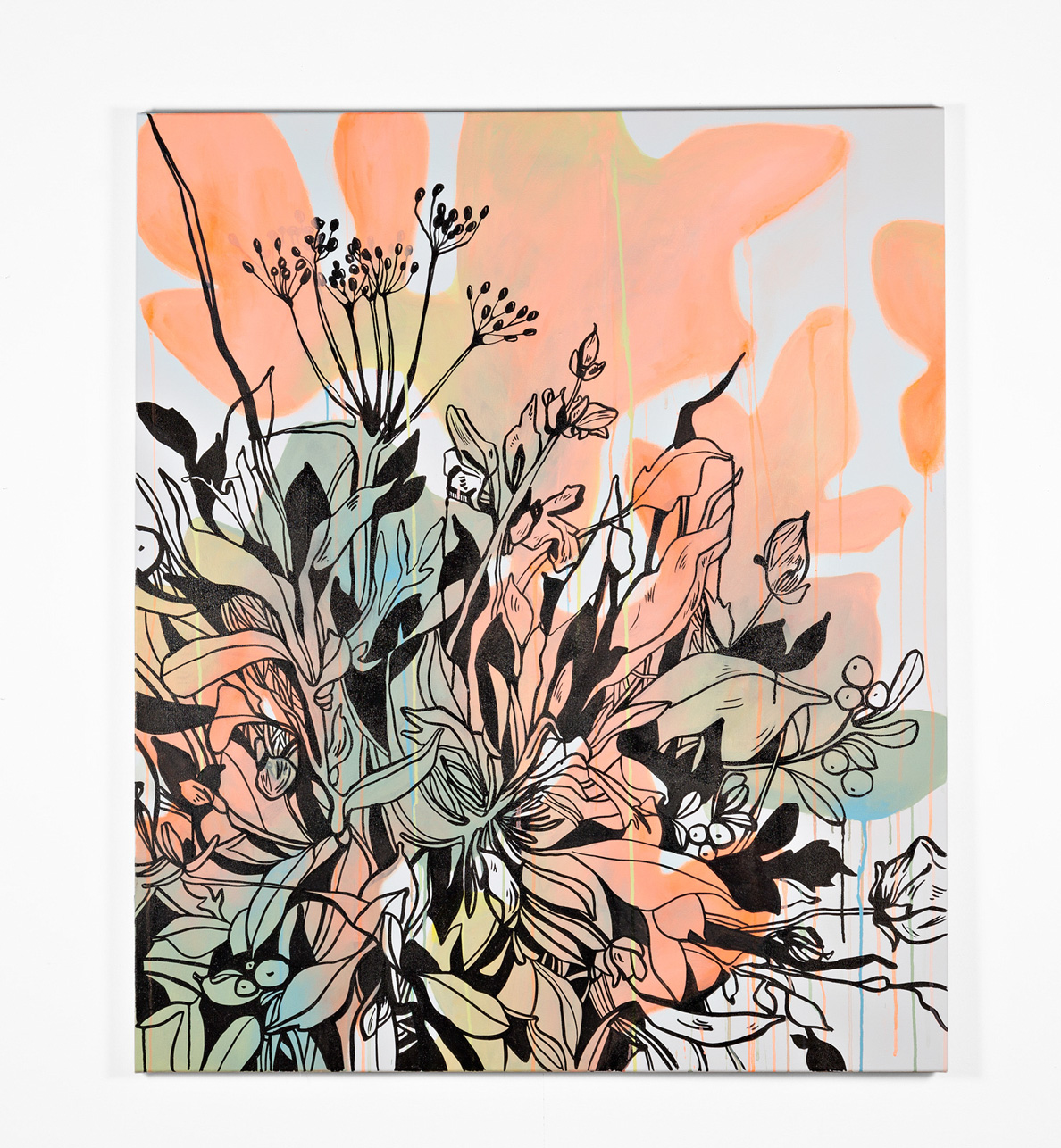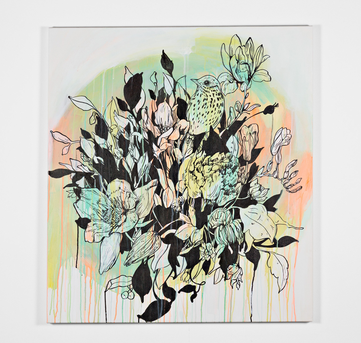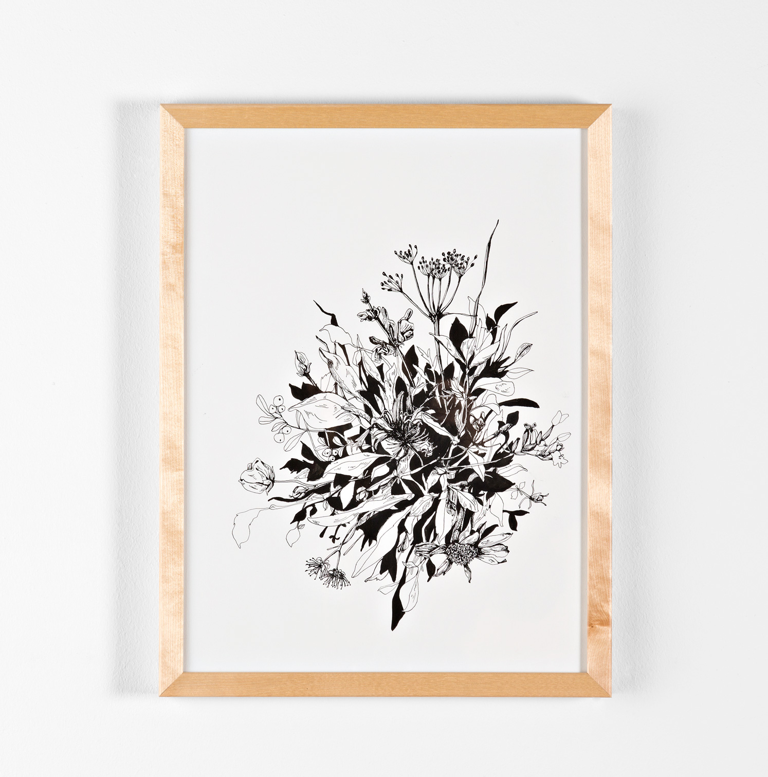 Frühlingserwachen. Üppig, verzweigtes Gewächs. Grafisch klare Formen wechseln sich mit malerischen Elementen ab. Das Genre der Blumenstilleben in neuer Interpretation. Grossflächige Malereien und Kleinformatige Tuschzeichnungen.