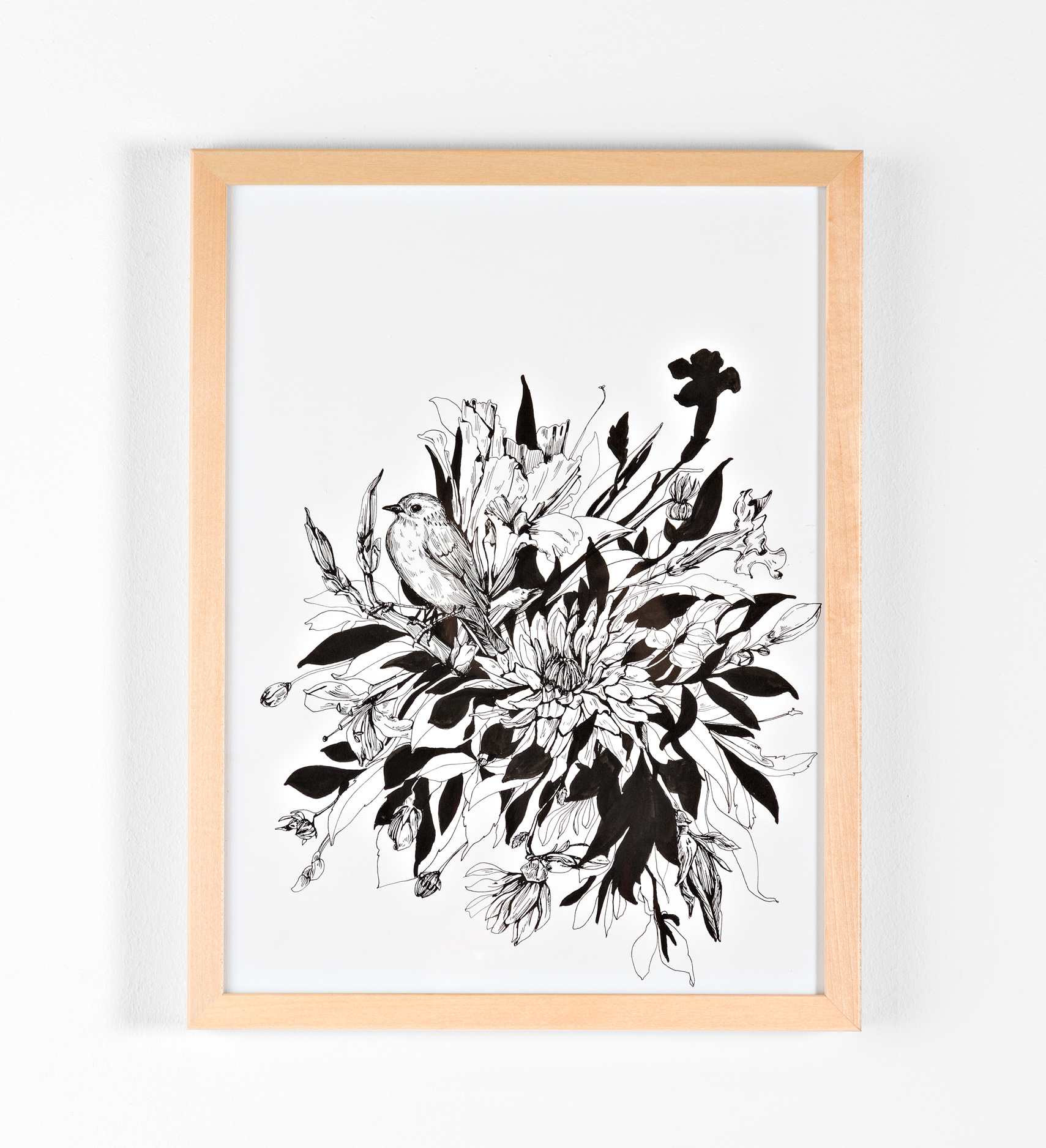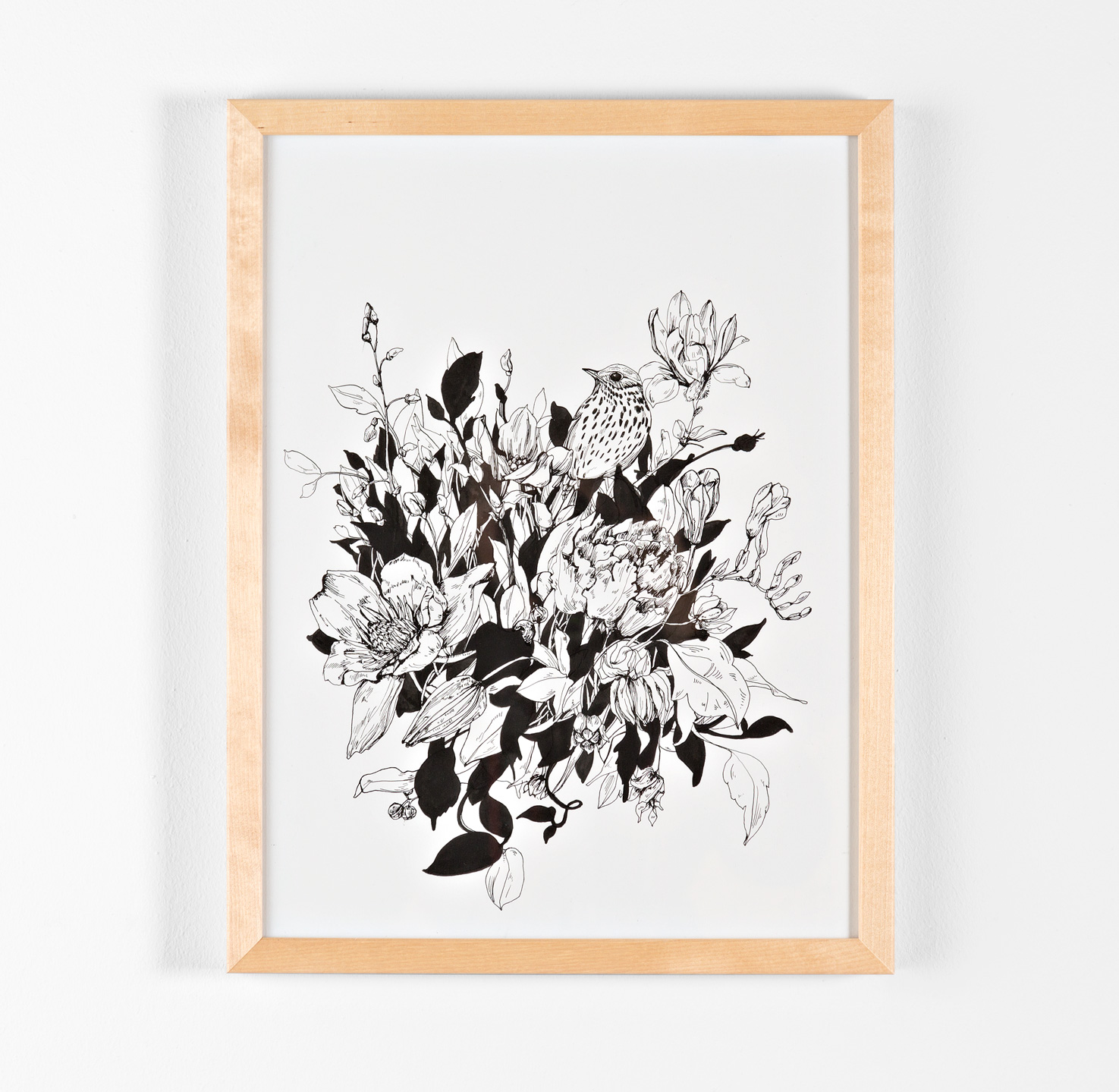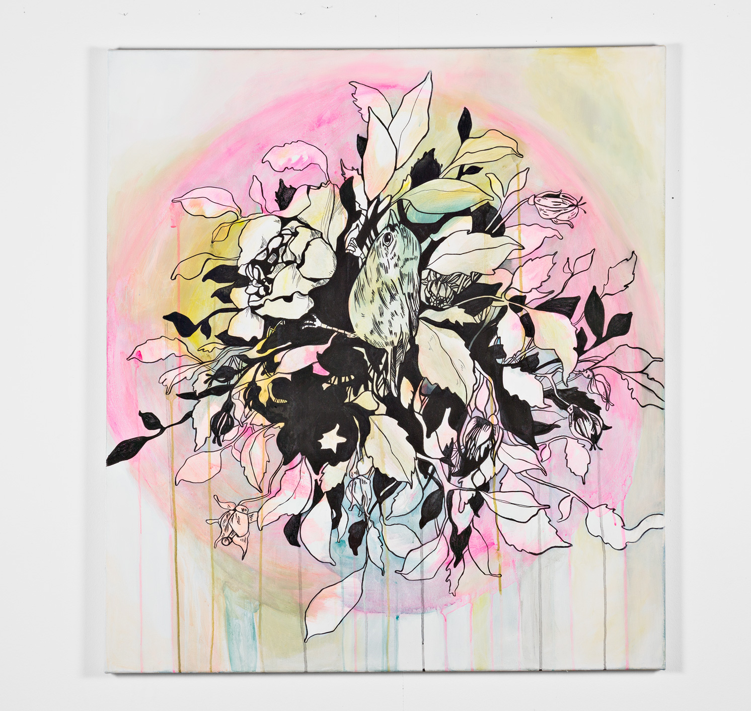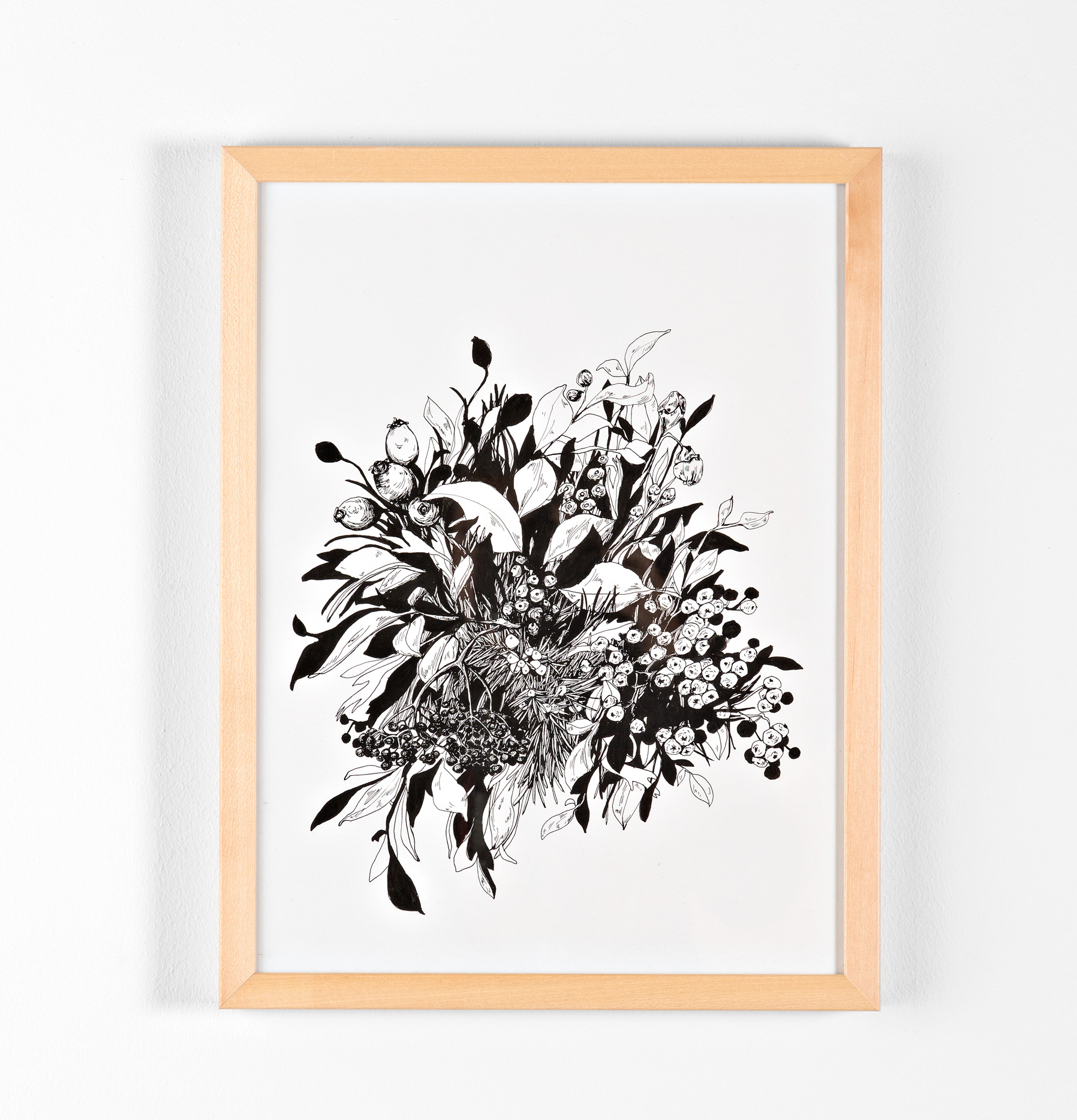 Frühlingserwachen. Üppig, verzweigtes Gewächs. Grafisch klare Formen wechseln sich mit malerischen Elementen ab. Das Genre der Blumenstilleben in neuer Interpretation. Grossflächige Malereien und Kleinformatige Tuschzeichnungen.